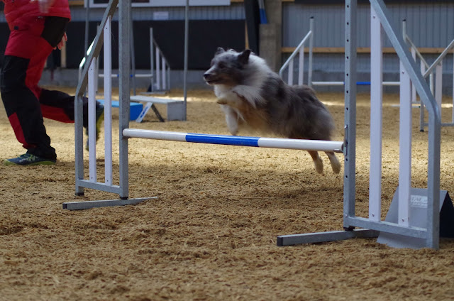 Efter at jeg først totalt havde afskrevet at nogensinde skulle løbe agility med ham igen, og efter endnu en operation, er han nu frisk som en havørn. Hans pels ser forfærdelig ud, på trods af diverse gode tilskud, og han er da også blevet lidt stivbenet efter et halvt års pause, men viljen og glæden, den er 100% intakt. Han brugte lige den første klasse til at rette ind efter gulvtæppet. Det kostede et par pinde og nogle store buer - men så skal jeg da love for, at han kom igen. Det var fantastisk at se den gamle cirkushest på banen igen - der, hvor han virkelig kan folde sig ud og brillere. Lavere spring og lidt lettere baner gjorde selvfølgelig også sit til, at det så legende let ud.