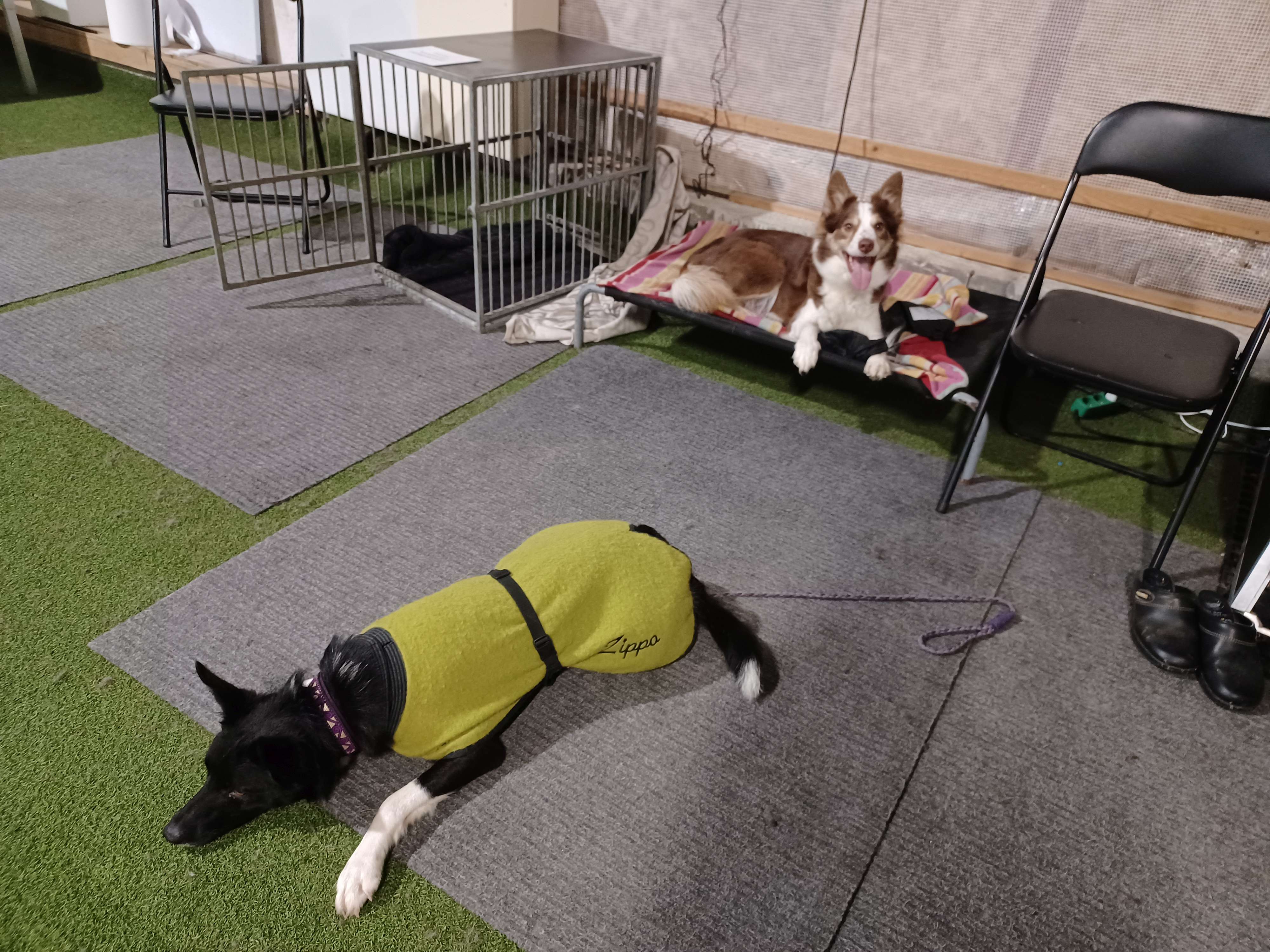 Keeper er også blevet rigtig dygtig til at slappe af, når hun er med til stævner. Her ligger hun i bilen med køledækken på, og hun kan faktisk se ud på banen. Hun skraber tæppet væk, så hun kan ligge på den lidt køligere metalbund, og så nytter det ikke noget, at jeg synes hun skal have noget blødt at ligge på. Og det hjælper måske også på stressniveauet, at hun har en afslappet Zoomi liggende ved siden af.