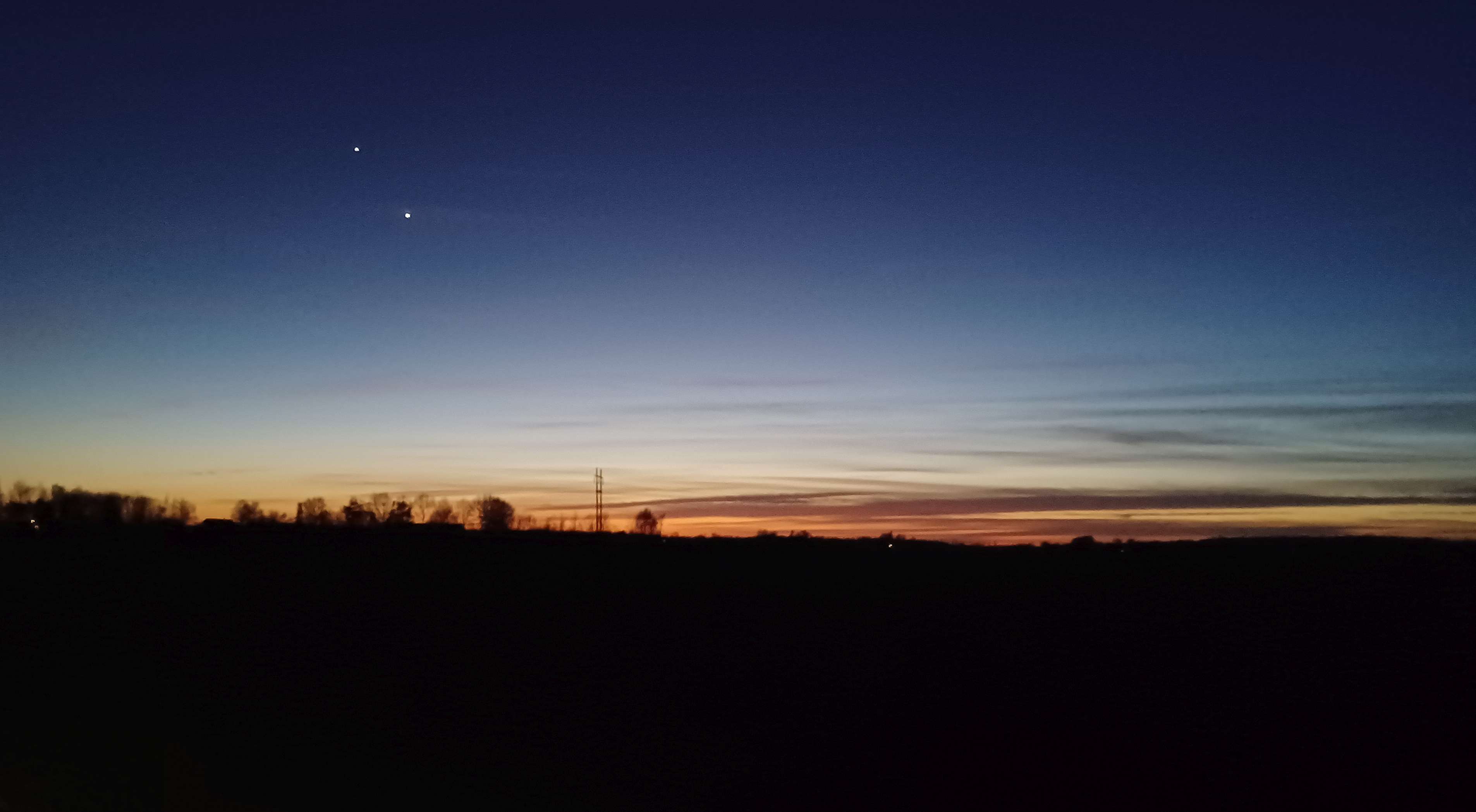 | Solnedgang på hjemturen, incl. Venus og Merkur, som åbenbart er usædvanlig tæt på hinanden i øjeblikket. |